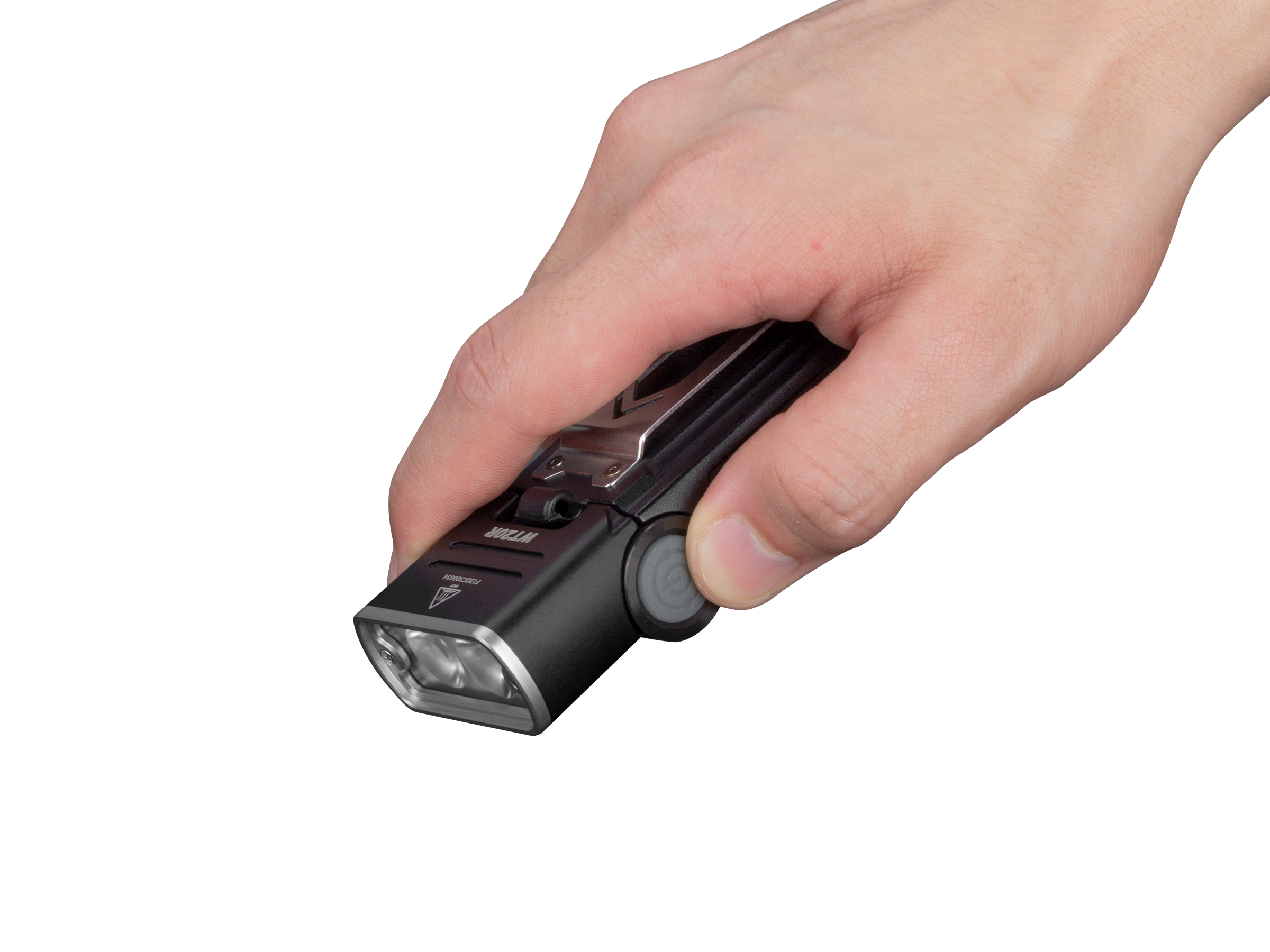Все режимы могут работать только поочередно. Они вносятся в память фонаря, чтобы первым включался именно тот вариант освещения, который работал перед выключением. Управляются все варианты яркости и включение Fenix WT20R одной прорезиненной кнопкой на боковой стороне корпуса.