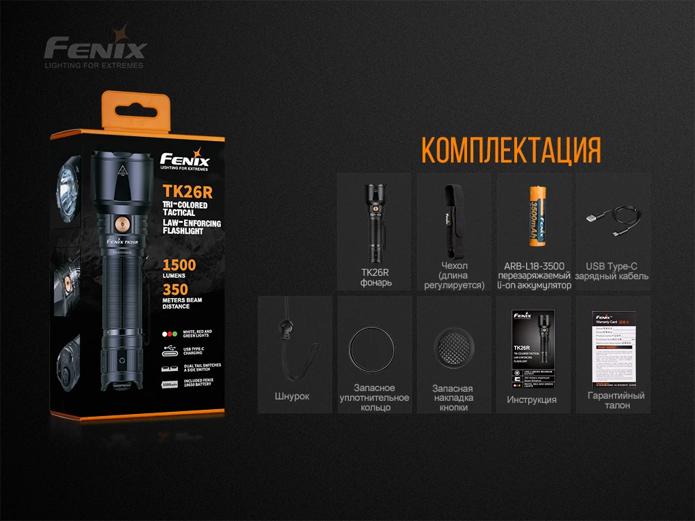 Модель фонаря Fenix TK26R, аккумулятор Fenix ARB-L18-3400, кабель USB Type-C, кабель для зарядки, ремешок на руку, чехол, запасное уплотнительное кольцо, резиновая накладка на кнопку, руководство к применению, гарантийный талон.
