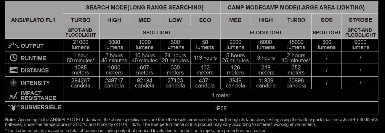 Перемещаться между режимами можно с помощью запатентованного переключателя FlexiSensa. В хвостовой части фонаря расположено колесико для перехода с дежурного режима на тактический. Функция блокировки защищает от случайного включения. Модель питается от фирменной батареи Fenix ARB-L21-5000 V2.0 с мощностью 5000 мАч. Заряжается батарея через USB-порт, скрытый под металлическим кольцом в передней части фонаря. При неправильной установке батареи в фонарь срабатывает защита от обратной полярности.